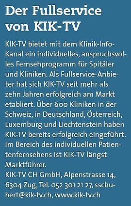 Wer im Spitalbett liegt, klickt sich meist irgendwann durch die angebotenen Fernsehprogramme. Auch wenn ihnen der Sinn nicht unbedingt nach Action und Klamauk steht, möchten Patienten dennoch unterhalten und informiert werden. Diese Überlegungen liegen der Philosophie von KIK-TV zugrunde. In zahlreichen Schweizer Spitälern wird der Klinik-Info-Kanal mittlerweile angeboten, der erfrischend anders daherkommt. Produziert wird der TV-Sender von Medienprofis, die sich bei der Gestaltung des Programms an Bedürfnissen, Ansprüchen und Interessen von Patienten orientieren. Das Programm verzichtet bewusst auf reisserische Unterhaltungsformate, sondern unterhält mit einem Mix aus Dokumentationen (GEO 360°), NZZ-Beiträgen und Reportagen über Natur, Gesellschaft, Erholung, Gesundheit und Wellness. Auch attraktive Kino- und Spielfilme, humorvolle Beiträge und tagesaktuelle Informationen aus der Region und aller Welt gehören zum Programm.