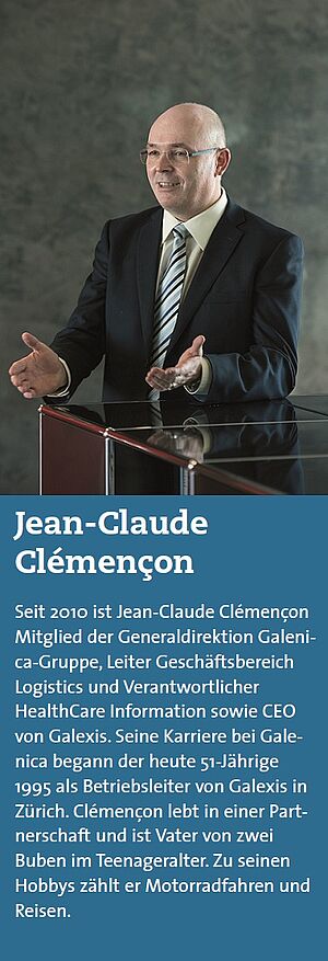 Galexis beliefert Spitäler und Heime täglich mit Medikamenten. Im Interview spricht Jean-Claude Clémençon, CEO Galexis und Mitglied der Generaldirektion der Galenica-Gruppe, über Logistikdienstleistungen, Kosteneffizienz, einheitliche Artikelstämme, künftige Trends – und über die Herausforderung, aus dem Lagerbestand von 42 000 Produkten den Kunden zuverlässig das richtige Produkt zur richtigen Zeit an den richtigen Ort zu liefern.