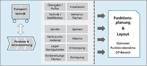 Damit die zukünftigen Prozesse in einem Spitalneubau ohne Einschränkungen aufgrund defizitärer Flächen durchgeführt werden können, ist die Definition von Flächenanforderungen Gegenstand eines logistischen Betriebskonzeptes. Bei der Flächenbestimmung werden logistische, hygienische, brandschutz- und bautechnische sowie medizinische Aspekte berücksichtigt und ganzheitlich abgestimmt. Am Ende eines logistischen Betriebskonzeptes stehen ein auf den Prozessen basierendes Raum- und Funktionsprogramm sowie eine dazugehörige Anordnungsstruktur. Ein logistisches Betriebskonzept muss ebenfalls für die einzelnen Bauphasen geplant werden. Hintergrund ist, dass sich die Transportwege in den einzelnen Interimsphasen, sowohl für den Patientenals auch für den Materialtransport, verändern können und es zum Teil zu einem reduzierten Angebot von Logistikflächen (Lagerflächen, Pufferflächen, Übergabeflächen) kommt.