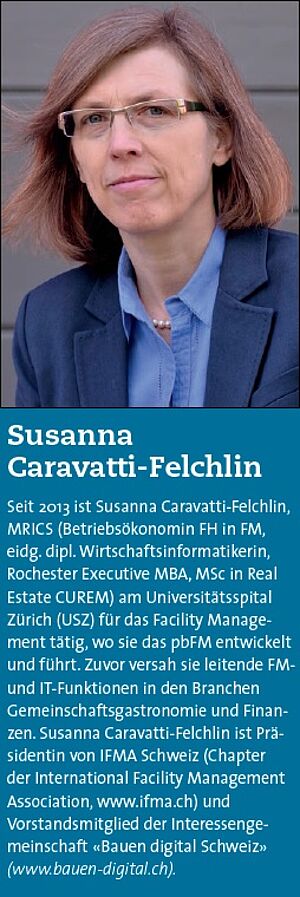 Susanna Caravatti-Felchlin: Leider  wird im FM noch zu wenig geforscht. Das Institut für Facility  Management (IFM) der ZHAW baut seit einigen Jahren die Forschung im FM  auf. Es ist an uns, den FM-Verantwortlichen in der Praxis, diese  Forschung zu unterstützen und mit den Forschern des IFM vermehrt  zusammenzuarbeiten. Das wollen wir einerseits in der IFMA erreichen,  aber auch im USZ: Das Engagement in der FM-Forschung erlaubt uns, den  Markt mitzuentwickeln.