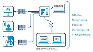 Neben der elektronischen Fallakte, der OP-Logistik mit Einsatz von Fallwagen oder der Ortung von Objekten, stellt die teilautomatische Materialerfassung eines der Leuchtturmprojekte aus dem Bereich der unterstützenden Prozesse im Krankenhaus dar. Hierbei werden die verwendeten Materialien sowie Arzneimittel bei dem Verbrauch am beziehungsweise bei der Gabe an den Patienten durch Scannen des Artikelbarcodes erfasst und verbucht.
