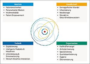 Der Weg hin zu einem digitalen und zukunftsfähigen Spital ist ein evolutionärer Prozess, der über viele Jahre stetig gegangen werden muss. Die Einführung neuer Technologien und Prozesse bedingt jedoch im ersten Schritt eine Betrachtung der derzeitigen und zukünftigen Einflussfaktoren und Trends. Es wird hierbei zwischen medizinischen, gesellschaftlichen und organisatorischen Einflussfaktoren unterschieden. Beispielhaft ist der demografische Wandel zu nennen. Die Themen wie Multimorbidität und die bekannte Problematik des Fachkräftemangels sind bereits heute spürbar und werden in Zukunft steigen. Gleichzeitig fordert die zunehmende Selbstbestimmtheit des Bürgers und Patienten (Patient Empowerment) zu einer veränderten Wahrnehmung der Anbieter von Gesundheitsleistungen. Organisatorisch spüren deutsche Krankenhäuser den Druck durch gestiegene Qualitäts- und Dokumentationsanforderungen. Neben den Einflussfaktoren sind die technischen Trends und Fortschritte genauer zu untersuchen und deren Übertragbarkeit für die Krankenhauslandschaft zu identifizieren. Die Digitalisierung und deren Vernetzung sowie die Einführung von Smart Devices und eine darauf aufbauende Mensch-Technik-Interaktion sind technische Trends, die weite Teile der Wissenschaft und Wirtschaft beschäftigt und auch im Gesundheitswesen intensiv betrachtet werden muss.